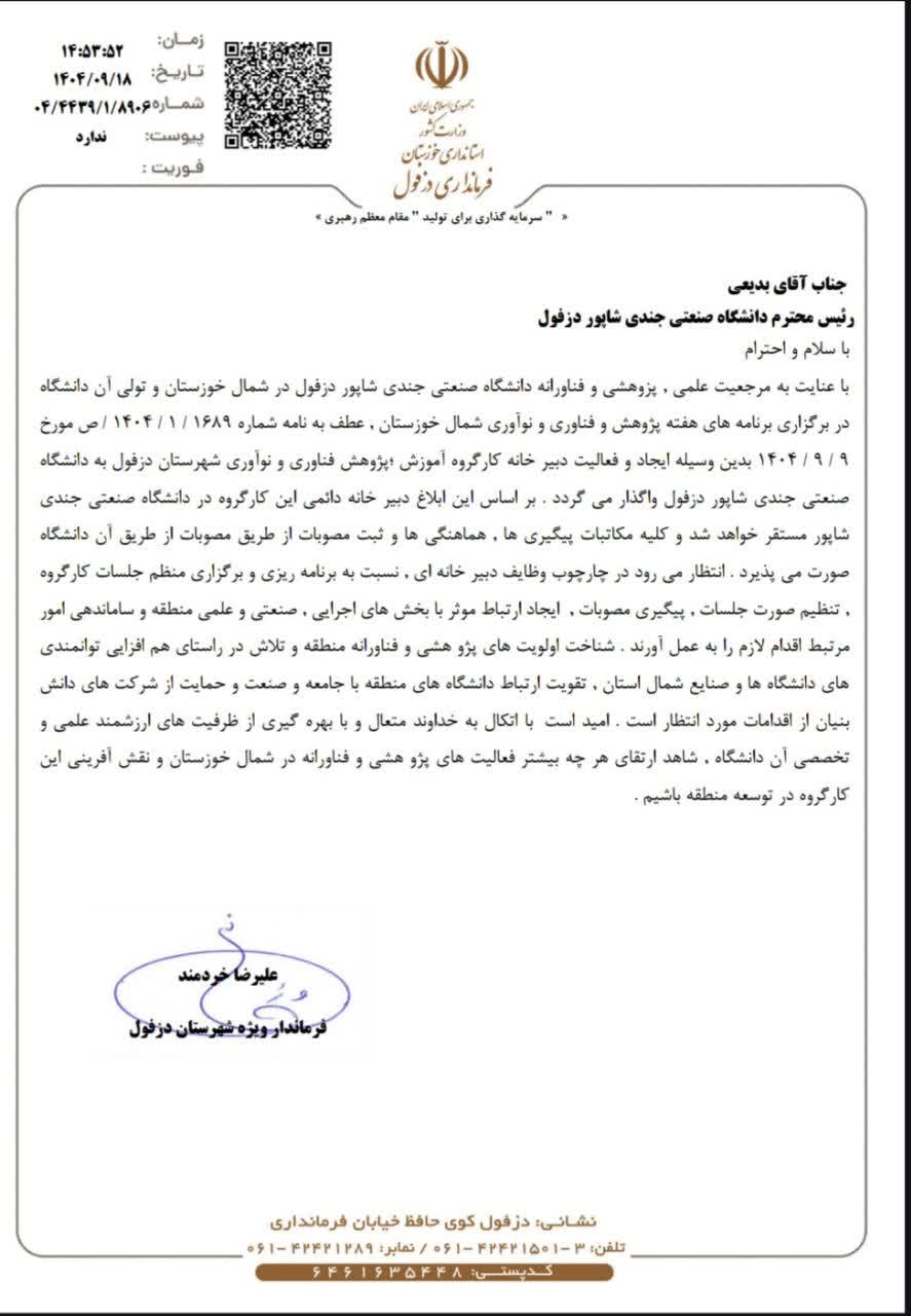 «با عنایت به مرجعیت علمی، پژوهشی و فناورانه دانشگاه صنعتی جندی شاپور دزفول در شمال خوزستان و تولی این دانشگاه در برگزاری برنامه‌های هفته پژوهش و فناوری شمال خوزستان، بدین‌وسیله ایجاد و فعالیت دبیرخانه گروه آموزش پژوهش و فناوری شهرستان دزفول به دانشگاه صنعتی جندی شاپور دزفول واگذار می‌گردد.