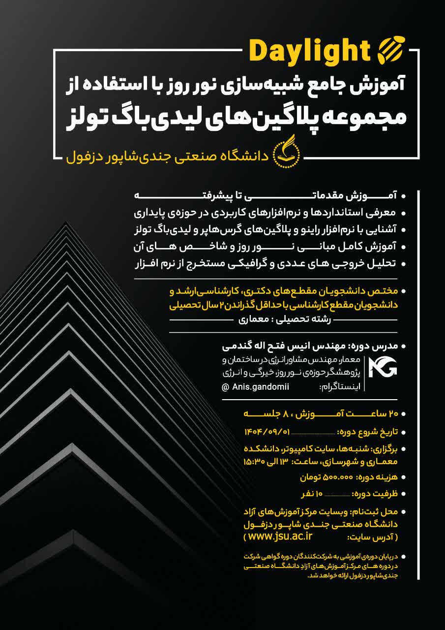 دوره جامع شبیه‌سازی نور روز با محوریت ابزارهای Ladybug Tools در دانشگاه صنعتی جندی‌شاپور دزفول برگزار می‌شود.